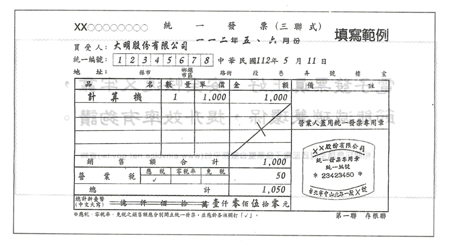 ![]() ※營業稅稅率為 5%,銷售額為 1,000,稅額計算為 1,000*5%=50,總計為 1,050 元。若報價客戶為 1,050 元(含稅),開立發票時需回推銷售額及稅額,計算方式如下:稅額=1,050/1.05=50,未稅金額為 1,050-50=1,000。 |