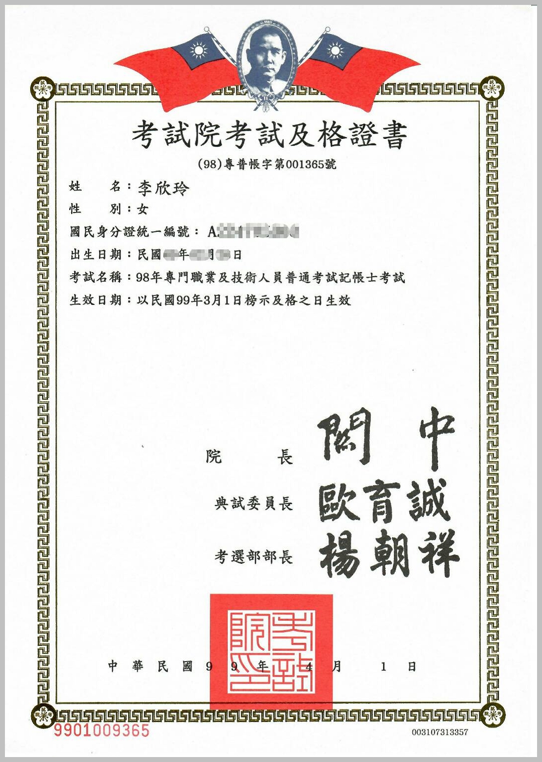 通過考試院專門職業及技術人員記帳士考試,並於財政部登錄為專業記帳士,依法加入社團法人臺北市記帳士公會,經政府主管機關合法登記執業之記帳士事務所。
