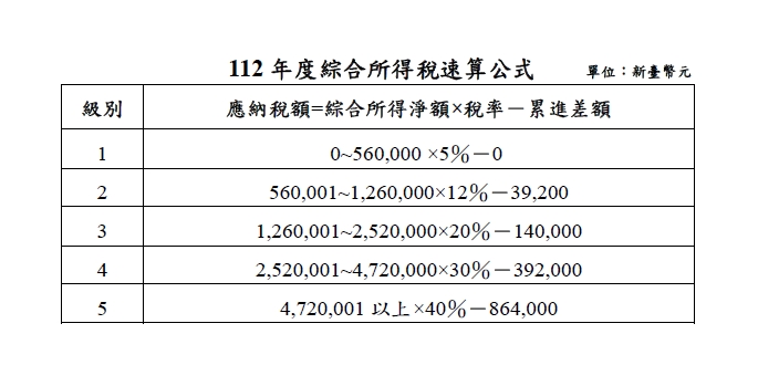 | 公告112年度綜合所得稅及所得基本稅額相關免稅額、扣除額、課稅級距及計算退職所得定額免稅之金額 |