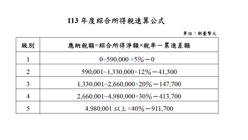| 公告113年度綜合所得稅及所得基本稅額相關免稅額、扣除額、課稅級距及計算退職所得定額免稅之金額 |