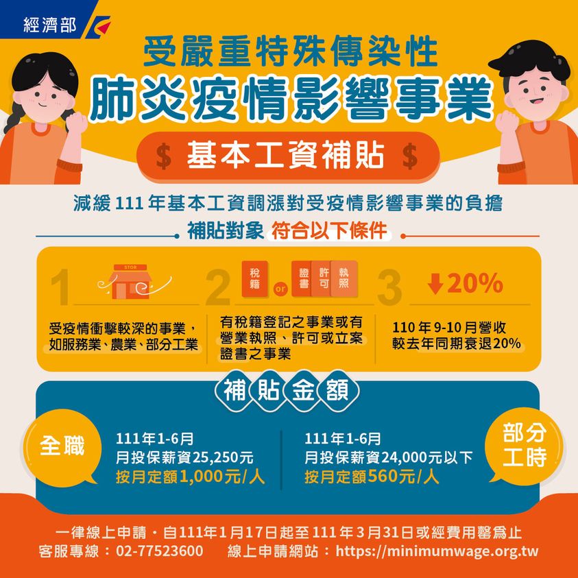 ![]() 受嚴重特殊傳染性肺炎疫情影響事業基本工資補貼 申請網址:https://minimumwage.org.tw/apply |