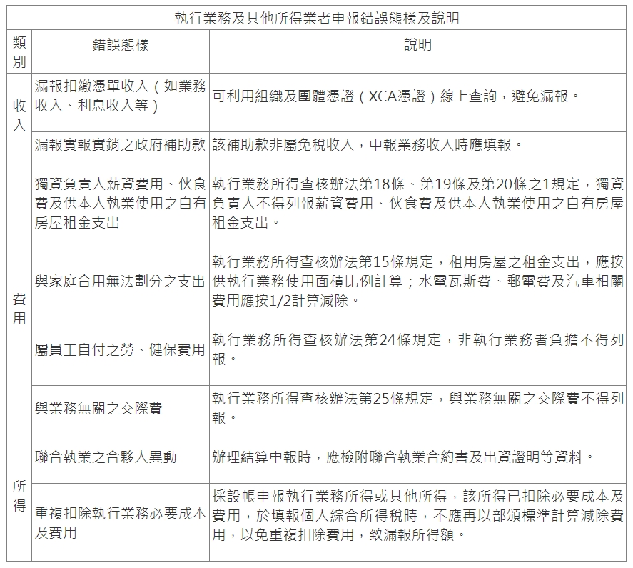 | 執行業務及其他所得業者申報所得稅,留意三大類別錯誤 |